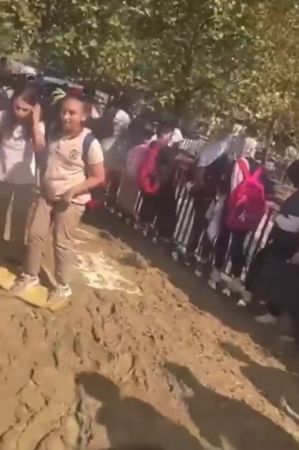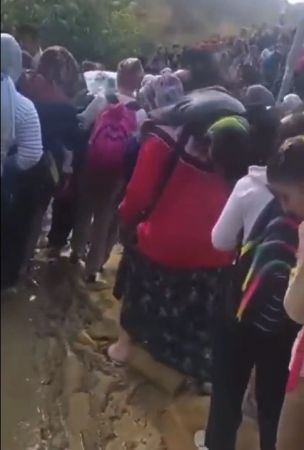 Videoda, öğrencilerin ve velilerin okul yolunda yağmur nedeniyle çamura dönen yolda yürümekte zorluk çektiği görüldü.