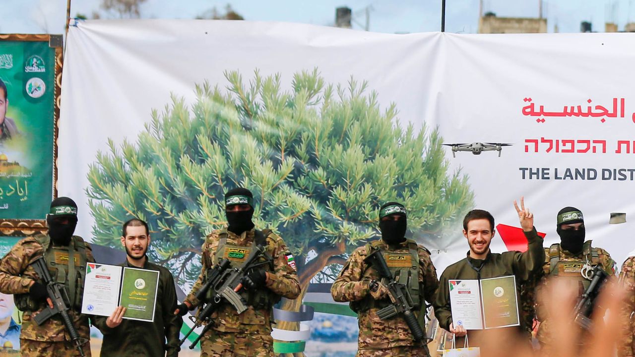 İsrailli esirlerden Omer Shem-Tov, Eliya Cohen ve Omer Wenkert, Gazze Şeridi'ndeki Nusayrat Mülteci Kampı'nda Kızılhaç'a teslim edildi.
