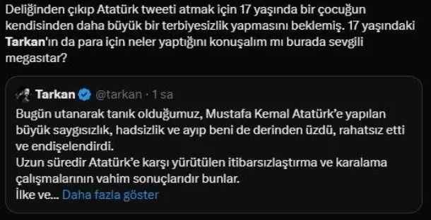 17 yaşındaki liseli bir gencin Mustafa Kemal Atatürk'ün resmiyle uygunsuz hareketler yapmasının ardından konuşan Tarkan,