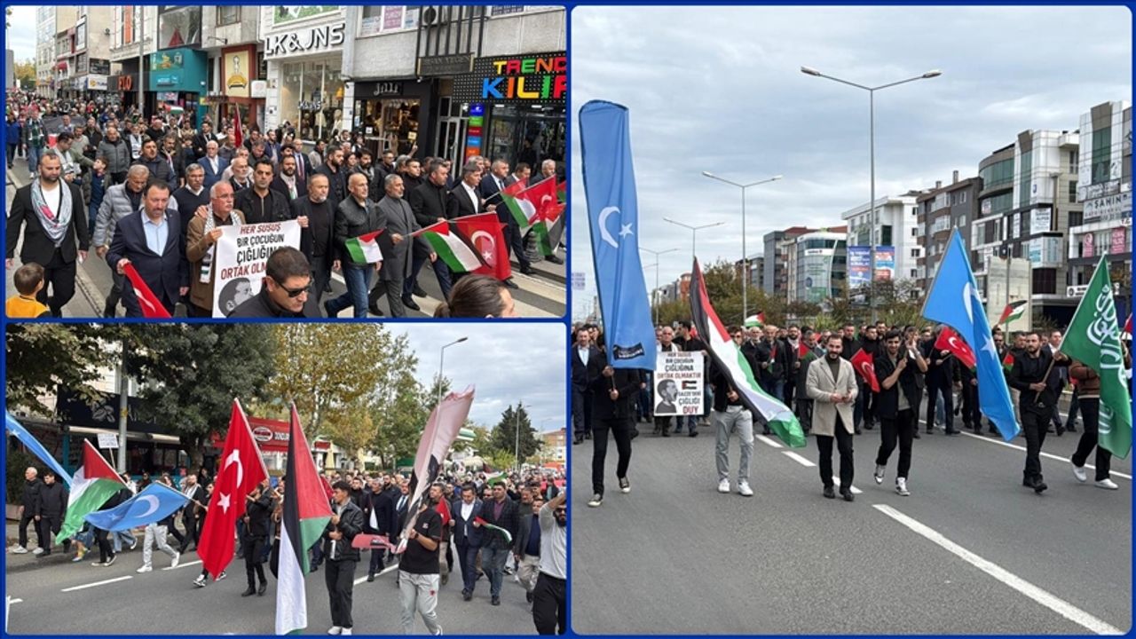 Çorlu Şehitliği önünde toplanan grup, Omurtak Caddesi'nden ellerinde Türk ve Filistin bayraklarıyla sloganlar eşliğinde Cumhuriyet Meydanı'na geldi.