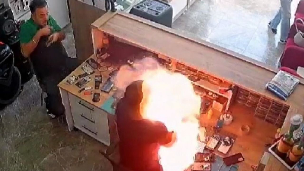 Alev topuna dönen batarya Özkan’ın çeşitli yerlerinde de yanıklara neden olurken, patlama anı iş yerinin güvenlik kamerasına yansıdı.