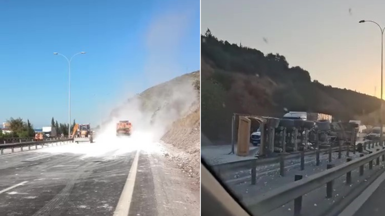 Kocaeli'nin Körfez ilçesi Kirazlıyalı mevkii TEM Otoyolu'nda saat 07.00 sıralarında İstanbul istikametinde seyir halinde olan mıcır yüklü TIR, sürücüsünün direksiyon hakimiyetini kaybetmesi sonucu devrildi.