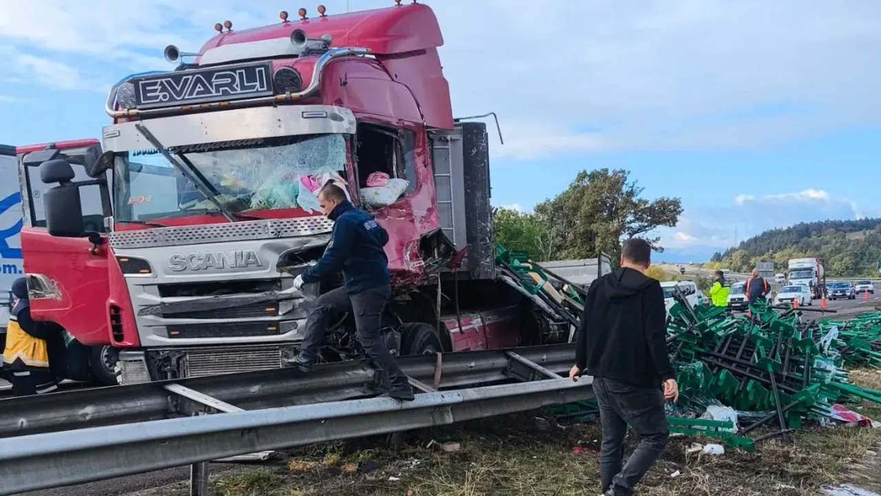 TEM Otoyolu’nun Bolu Batı Gişeleri mevkiinde sabah saatlerinde meydana gelen kazada, Uğur V. yönetimindeki tır, kontrolden çıkarak refüjdeki demir bariyerlere çarptı.