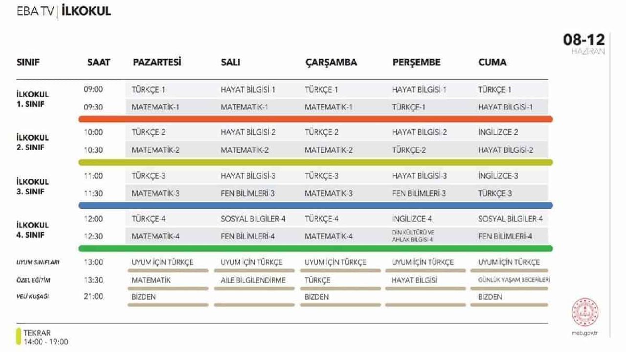 İlkokul 1.2.3.4. sınıf canlı ders programı ( 8 / 12 Haziran 2020)