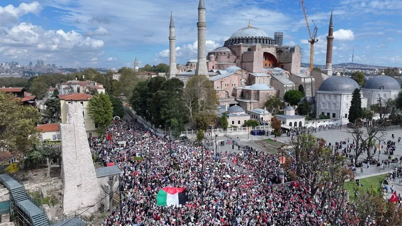 Filistin'e Destek Platformu çatısı altında bir araya gelen binlerce kişi Ayasofya Camisi önünde toplandı.
