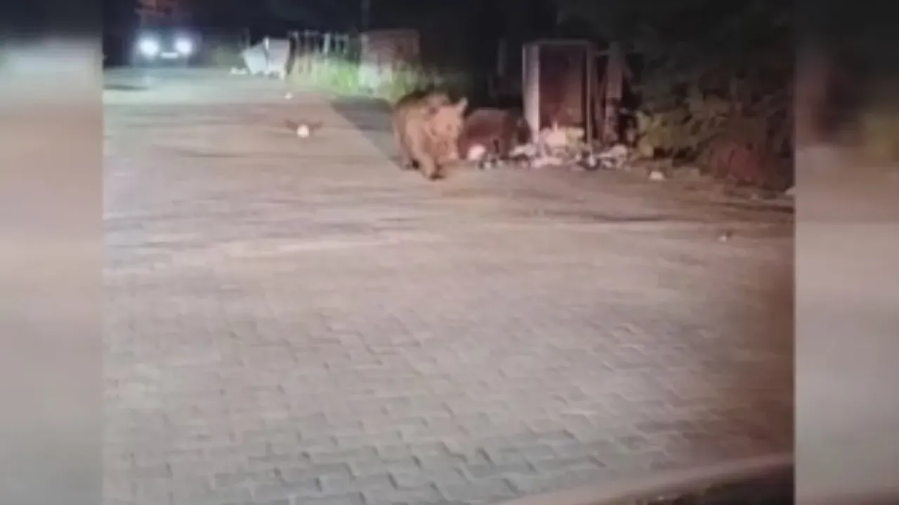 Yol kenarında yiyecek bulan ayı ailesinin görüntüleri, bölgede bulunan bir vatandaş tarafından cep telefonu kamerasıyla kaydedildi.