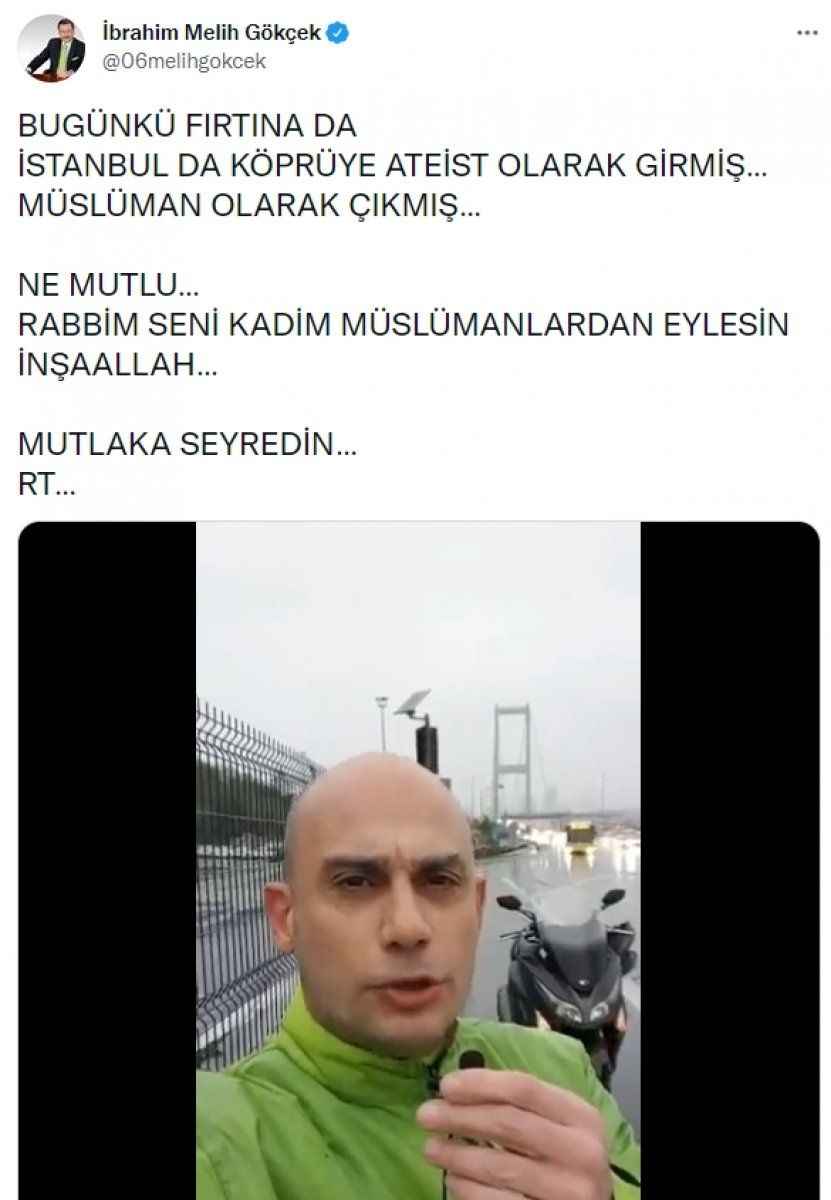 Videoyu Twitter hesabından paylaşan Gökçek, "Bugünkü fırtınada İstanbul'da köprüye ateist olarak girmiş, Müslüman olarak çıkmış. Ne mutlu. Rabbim seni kadim Müslümanlardan eylesin inşallah. Mutlaka seyredin" ifadelerini kullandı.