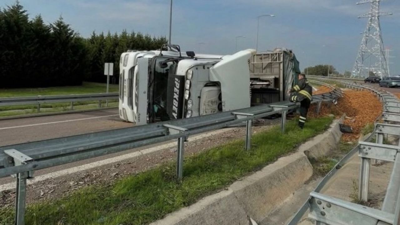 Alınan bilgilere göre İstanbul'dan Bursa yönüne gitmekte olan mısır silaji yüklü tır, yağış nedeniyle kayganlaşan yolda sürücünün direksiyon hakimiyetini kaybetmesi ile kontrolden çıkarak devrildi.